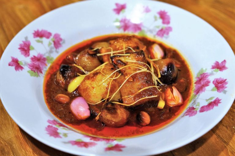 These characteristics suggest an origin in the Indian cuisine and the history of the region points at the neighboring Burmese cuisine. Burma (today’s Myanmar) ruled the northern part of Thailand between the 16th and the 18th centuries and this curry is believed to have been embraced by the Thais at that time. In fact, Gaeng Hang Le is often referred to as Burmese curry in northern Thailand.