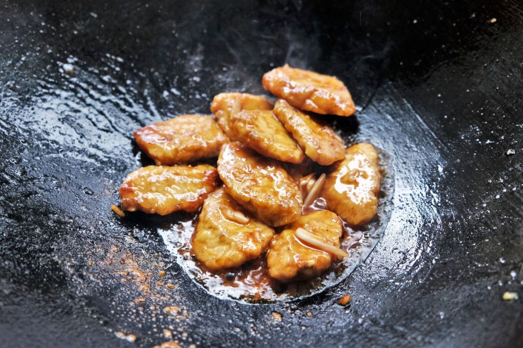 2.In a wok, heat a little bit of vegetable oil (I like to use avocado oil) fry the jackfruit or tempeh on medium to high heat, until they start to turn brown. Add sugar, a pinch of salt, white pepper. Season with light soy sauce, tomato puree and very little dark soy sauce.