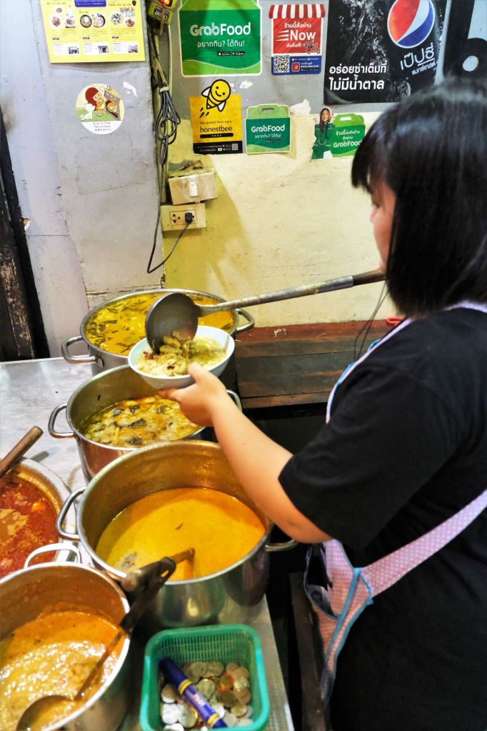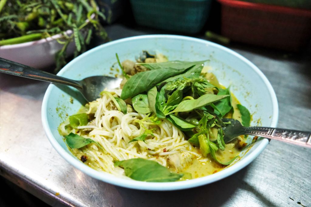 ‘Khanom Jeen’ is a fave, so I went peeking at the street facing tiny restaurant. The lovely owner had explained the few available options and I picked ‘Khanom Jeen Gaeng Kiaw Wan’, rice noodles with green curry.