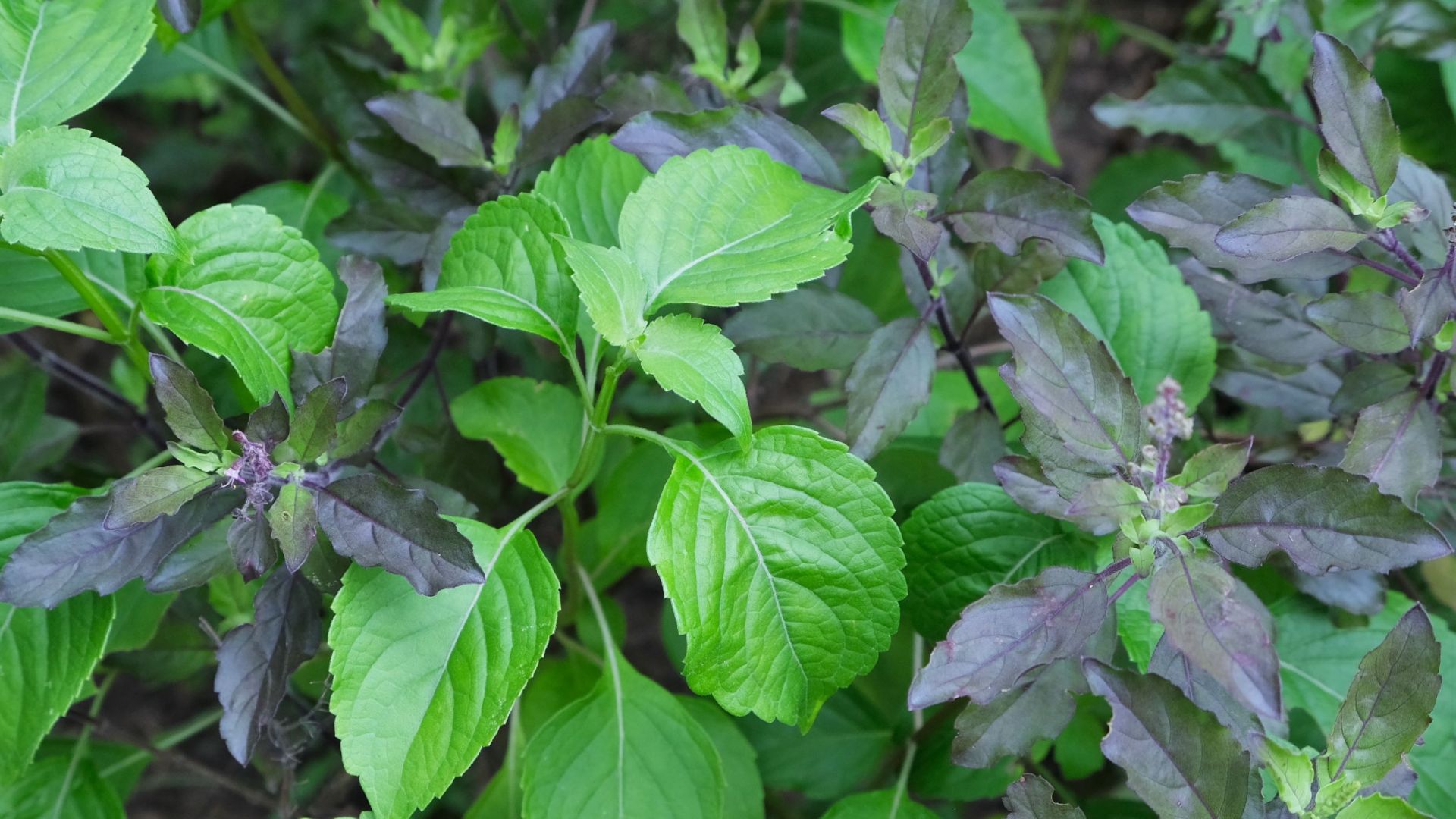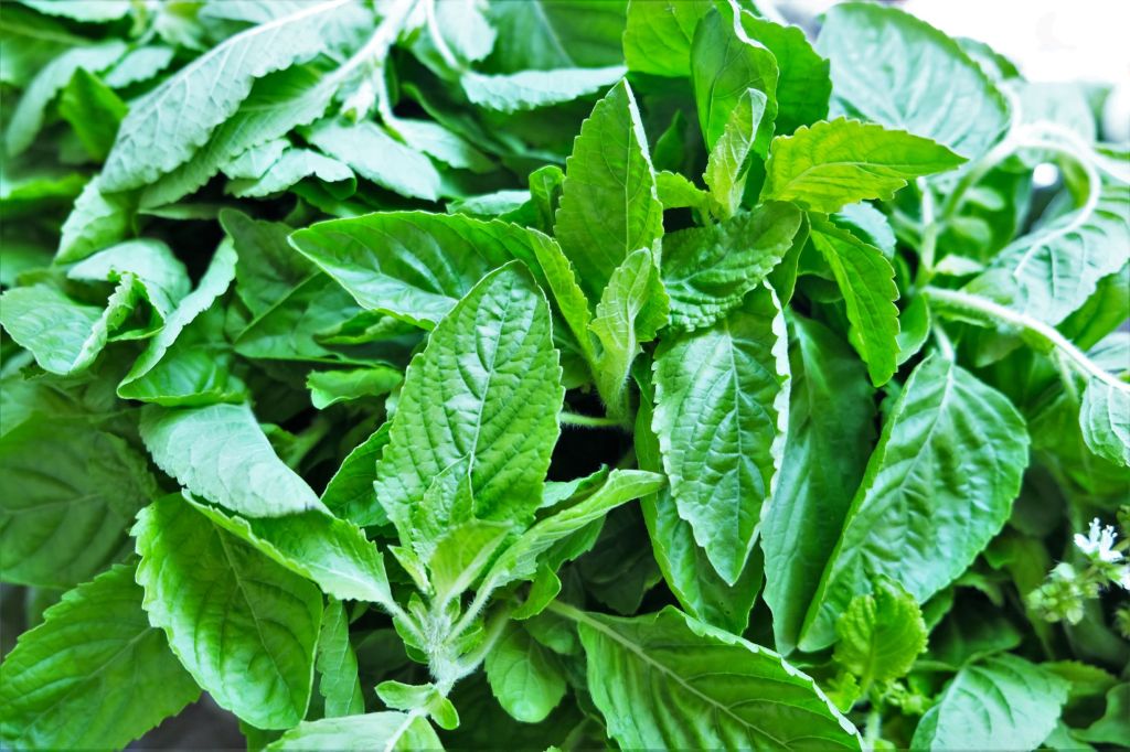 The plant is a small shrub, stems are hairy and leaves have a gently jagged margin. There are a green and purple varieties, both of which are used for cooking, The flavor of the purple variety is often a bit stronger.