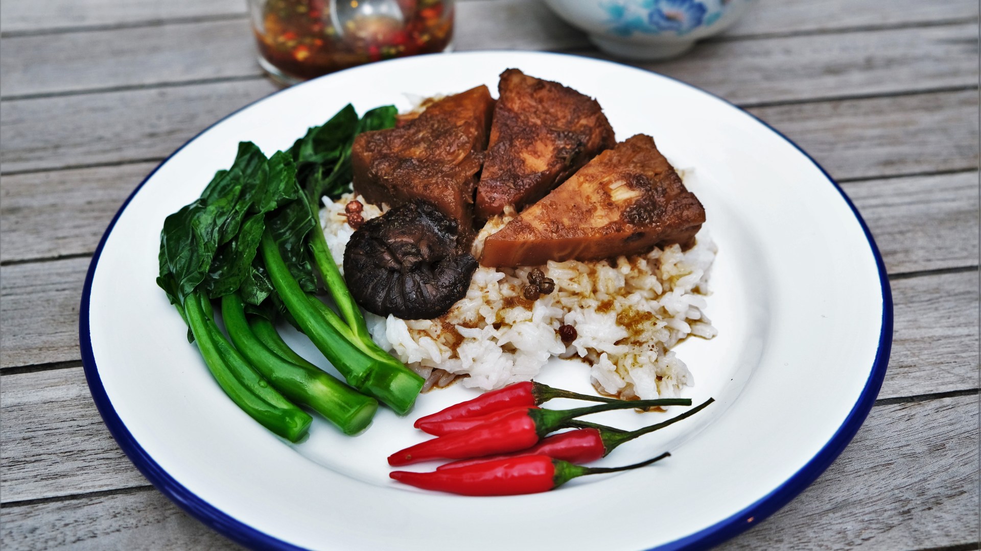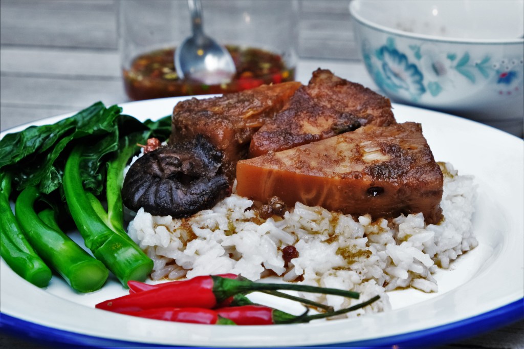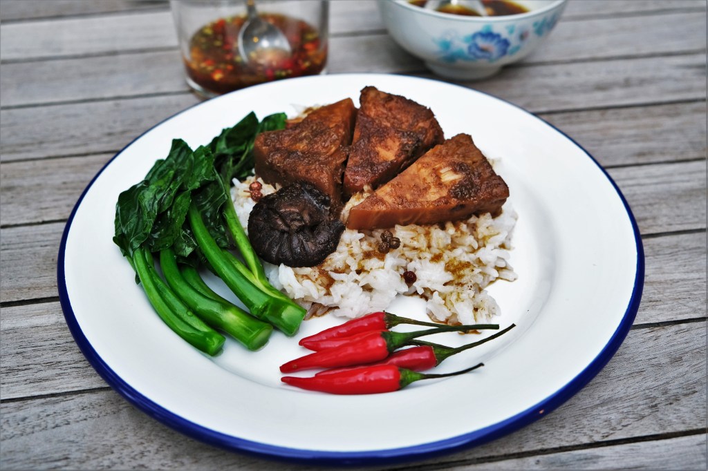 This is a comforting savory on the sweeter side dish, with wonderful five spice aromas, dark gravy and a pad of white rice that soaks up all that goodness. Poached greens like Chinese broccoli ‘Pak Kana’ in Thai, pickled mustard greens, ‘Kee nu’ chilies and spicy and sour condiments are also served to lighten up the feast.