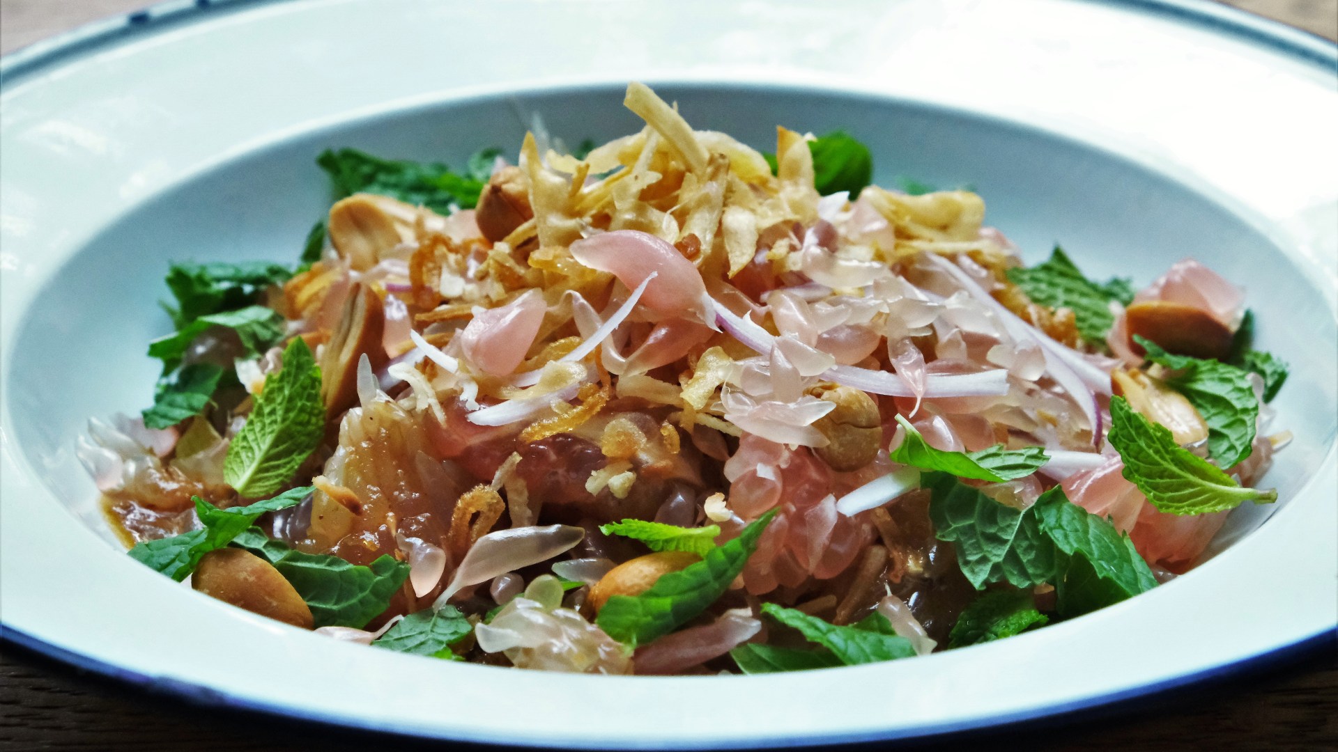 The pomelos are mixed with dry ingredients like fried shallots, peanuts and roasted coconut flakes that give nice contrasting crunchy textures and fresh herbs cloak the salad with essential oil perfumes.