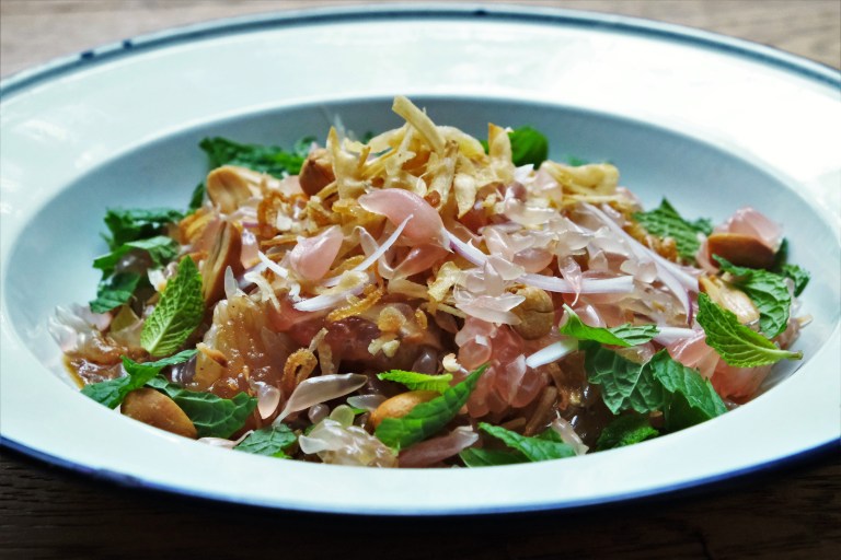 The dressing for the ‘Yum som O’ is a combination of coconut cream, Nam Prik Pao, tamarind puree, a little bit of coconut sugar, light soy sauce and lime juice.