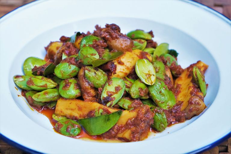 The dominant flavor or rather the fragrance comes from the beans, while southern curry paste rich with red chilies, turmeric and black pepper, provides the seasoning and the binding medium. Shrimp or pork are usually paired with the beans in this stir-