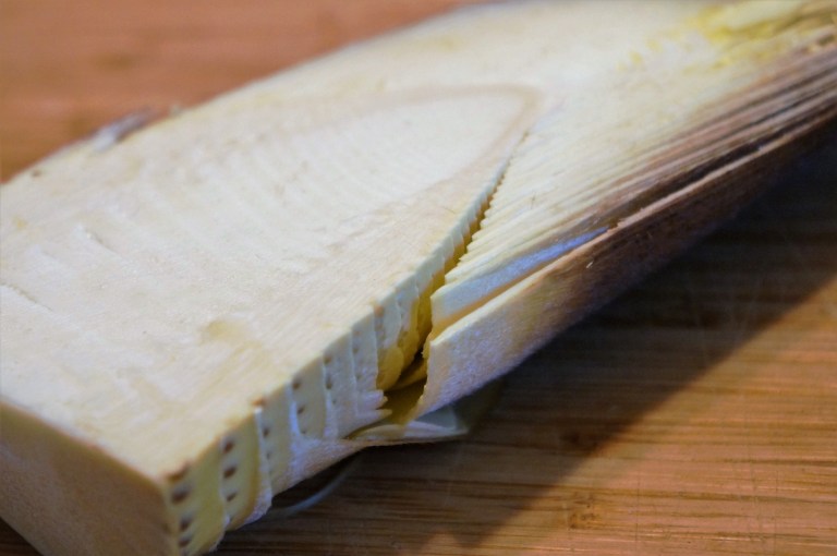 - Trim off a thin cross section from the bottom of the bamboo shoot cone.