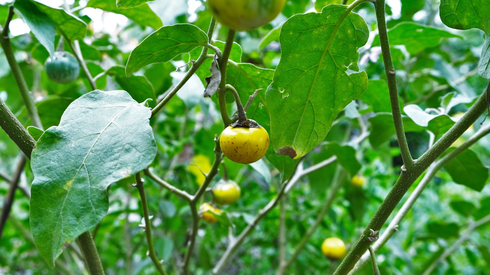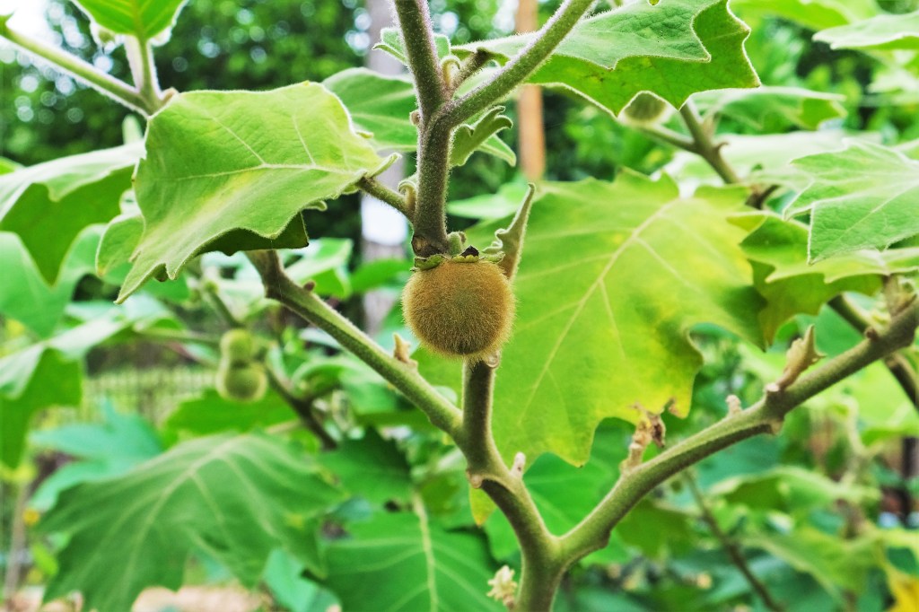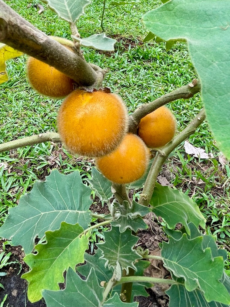 ‘Maeuk’ Hairy eggplant is also rounded and similar in size to the apple eggplant. The ripe fruits are orange in color and have distinct furry skin. This eggplant is unlike common eggplants, it is fruity sweet and sour, almost the flavor of kiwi and possibly related or at least reminiscent of Narnajilla (another fruity solanum from Central America. ‘Maeuk’ is used in special ‘Nam Prik’ relishes, salads and curries.