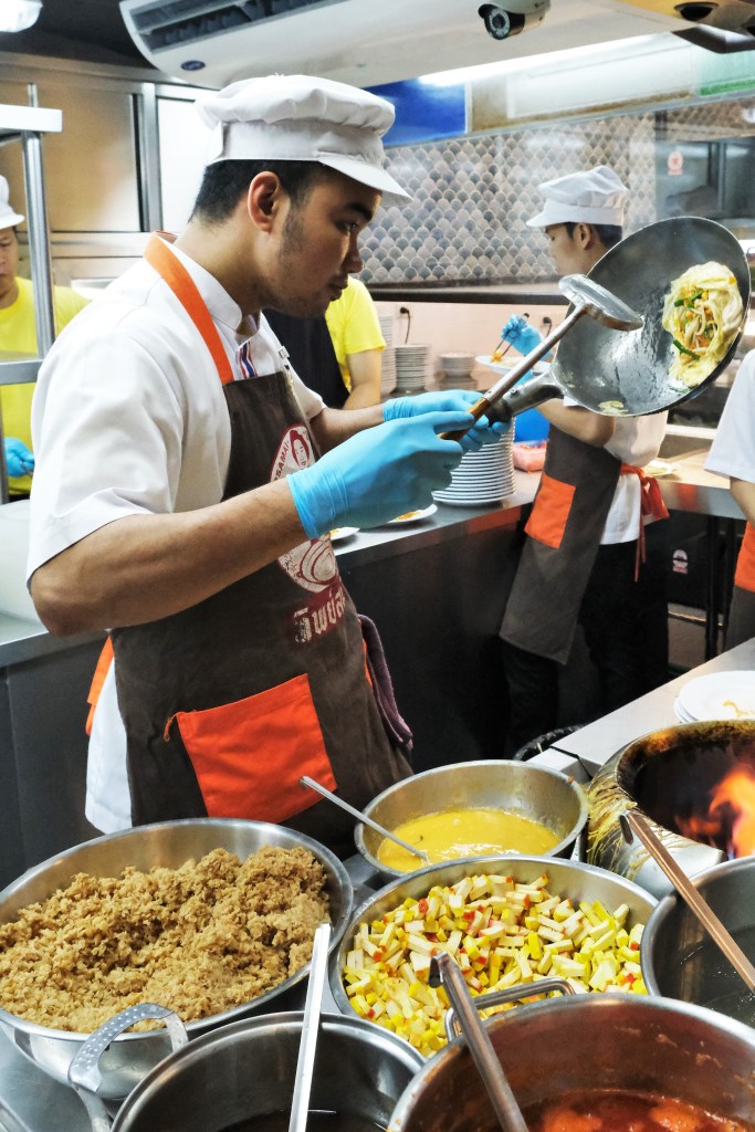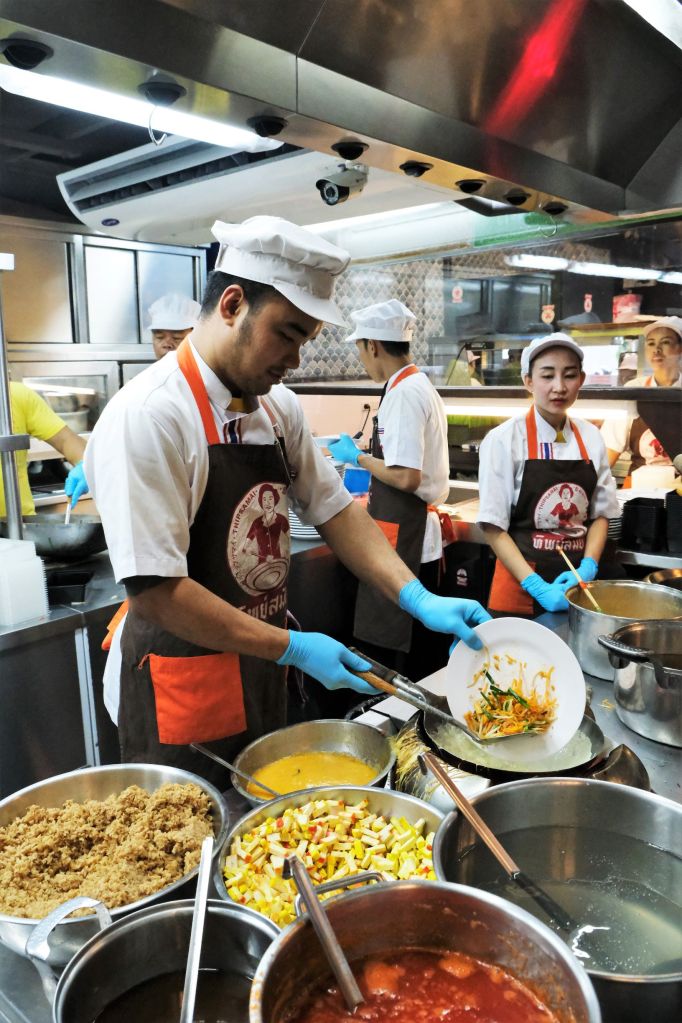 Expect to stand in a well organized line before actually making it into the restaurant. The heavy traffic of local and foreign diners and the large team of cooks and waiting staff add to the general feeling of a food ‘mecca’. The secret of Thipsamai’s pad Thai is in the sauce that is stirred into a large pile of noodles and vegetables. Noodles are apportioned to individual servings and skillful cooks are finishing the dish by quickly frying a thin omelette crepe in a fiery wok, fried noodles are placed at the center of the crepe and within a blink of an eye and spectacular wok skills the noodles are wrapped with the crepe before the entire thing is plated.
