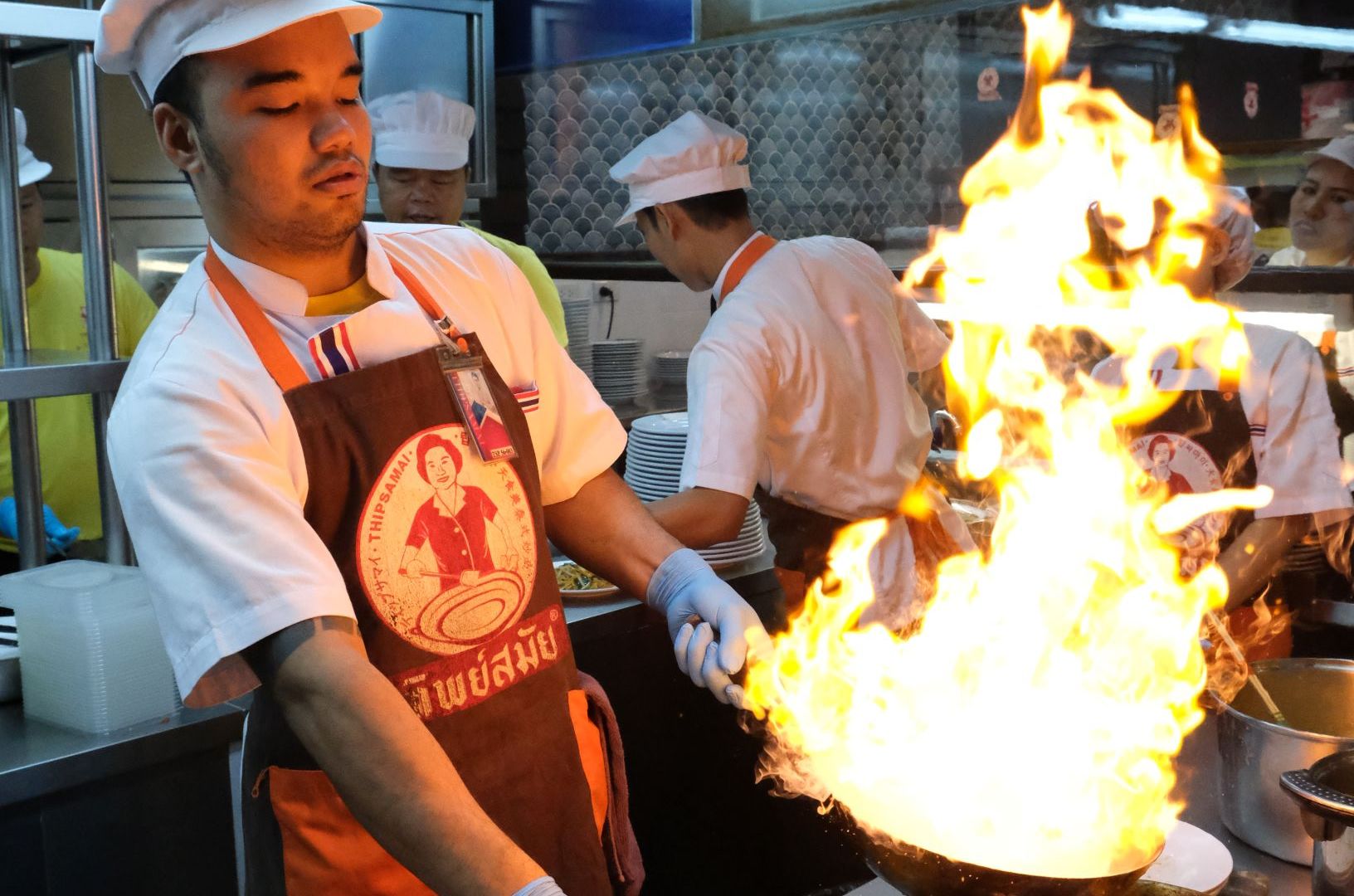 The history of the restaurant goes back to the mid 20th century when a young married couple Ms. Samai and Mr. Chote, had opened the first pad Thai stall in Bangkok. An endorsement from the prime minister Pleak Phibunsongkhram granted a nation wide recognition and led to the establishment of ‘Thipsamai Padthai Pratoopee’ as a restaurant. When the couple got older and couldn’t look after the restaurant it has been sold to the current owner, who has retained the original recipe keeping the restaurant’s reputation of the best pad Thais in the capital and possibly the entire country.