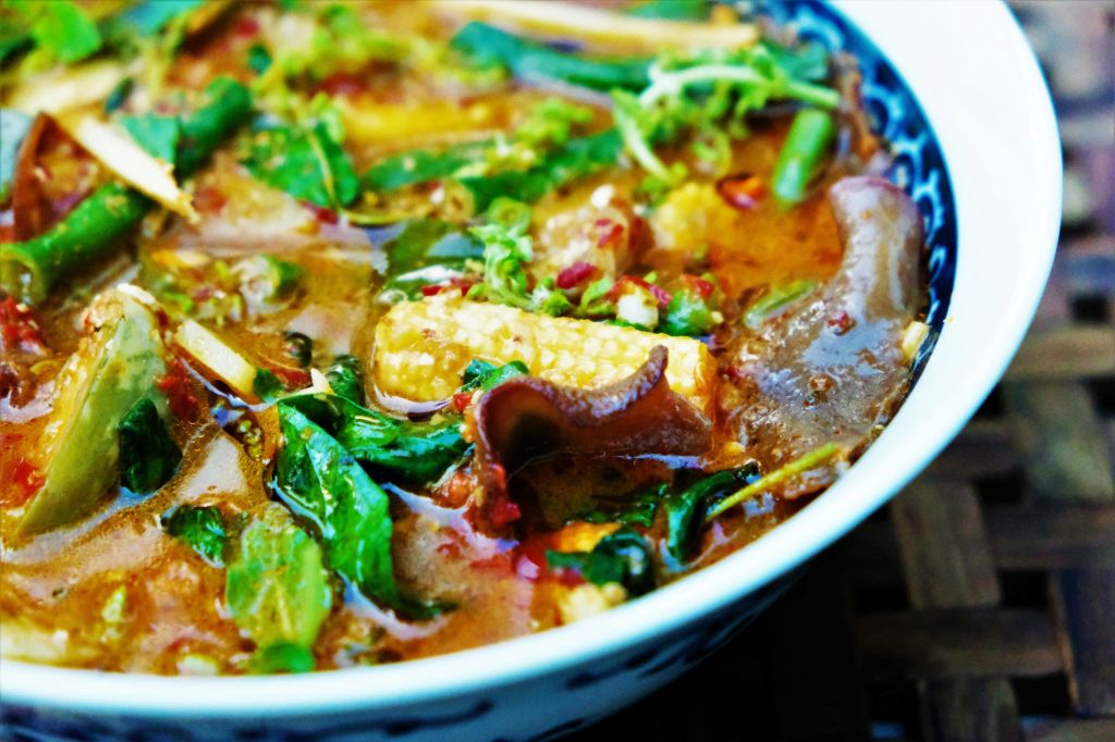 Unlike many of the more famous Thai curries, this curry is prepared with no coconut milk rather with water or stock. It should be soupy and taste salty and quite spicy, especially in the absence of coconut milk to tone the heat down.