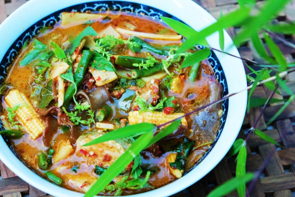 Vegetables like eggplant, bamboo shoots, and yardlong beans are commonly used. Wild forest mushrooms also perfectly complement this curry. A large number of chilies, wild ginger, makrut leaves, and holy basil give this curry its hot and distinct herbaceous and almost medicinal flavors. Thais would often prepare it with pork, wild boar, frogs, fish, or poultry as the main protein. In my plant-based version, those are obviously omitted while mushrooms and fermented organic soybean paste are added for depth of flavor.