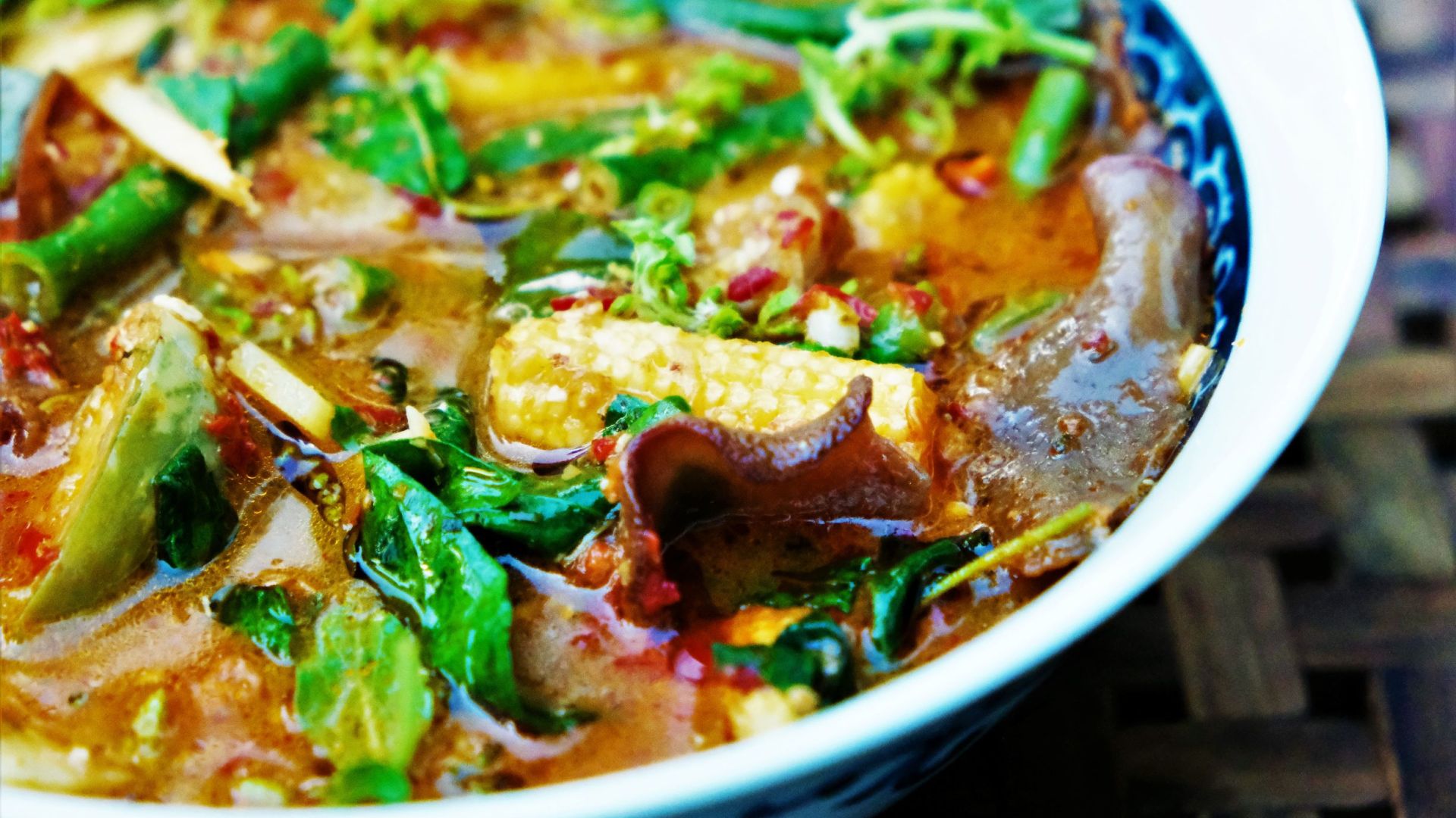 Unlike many of the more famous Thai curries, this curry is prepared with no coconut milk rather with water or stock. It should be soupy and taste salty and quite spicy, especially in the absence of coconut milk to tone the heat down.
